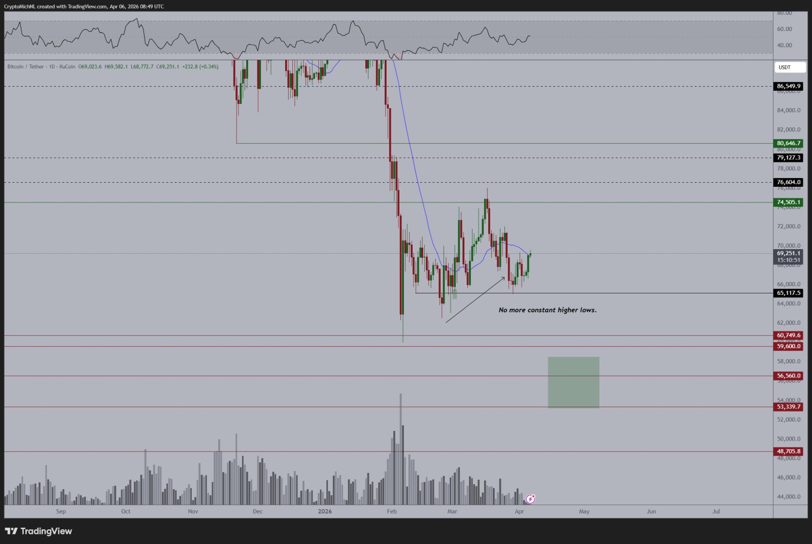 „Ein seit Februar 2026 beständiges Muster: Jede Annäherung an den Bereich von 70.000 bis 80.000 US-Dollar stößt auf geringe Liquidität und Gewinnmitnahmedruck, was den Aufschwung begrenzt.“
