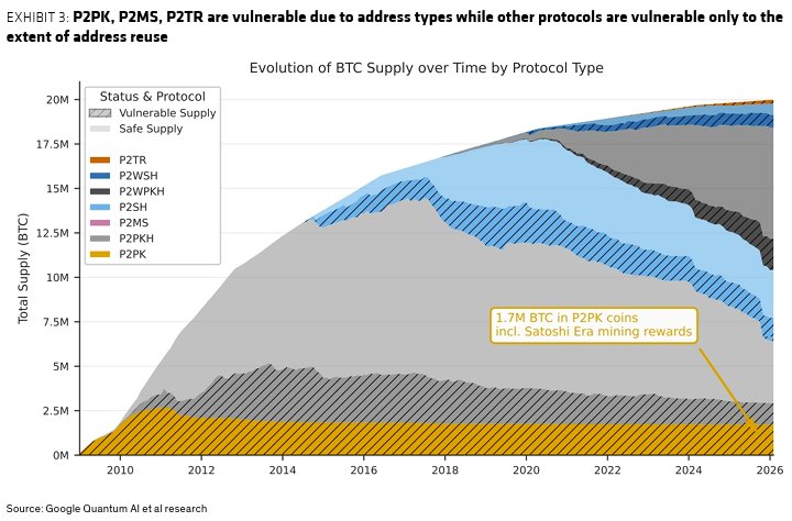 Besonders ausgeprägt ist das Risiko bei älteren „Legacy“-Wallets. Ungefähr 1,7 Millionen Bitcoin, einschließlich Schätzungen 1,1 Millionen BTC werden Satoshi Nakamoto zugeschriebenwerden in frühen P2PK-Adressen gespeichert, wo öffentliche Schlüssel dauerhaft offengelegt werden.