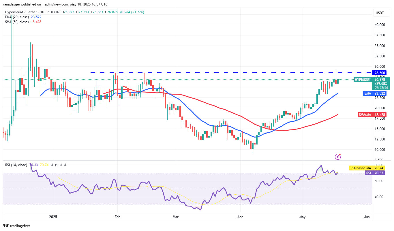 Die upsloping bewegenden Durchschnittswerte und die RSI in der überkauften Zone zeigen, dass die Käufer den Befehl haben. Eine Pause und ein Schließen über 28,50 USD könnten das Hype/USDT -Paar in Richtung 35,73 US -Dollar katapultieren.