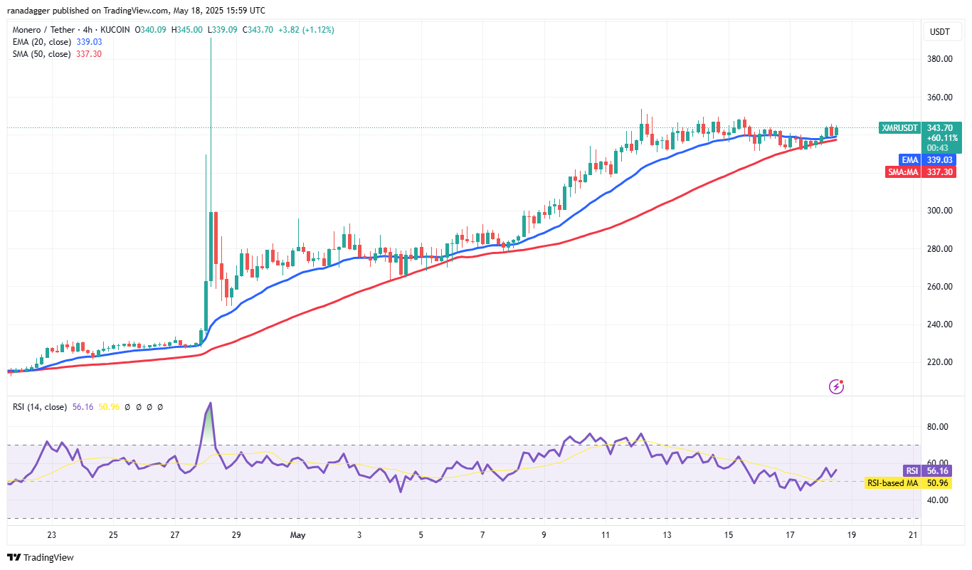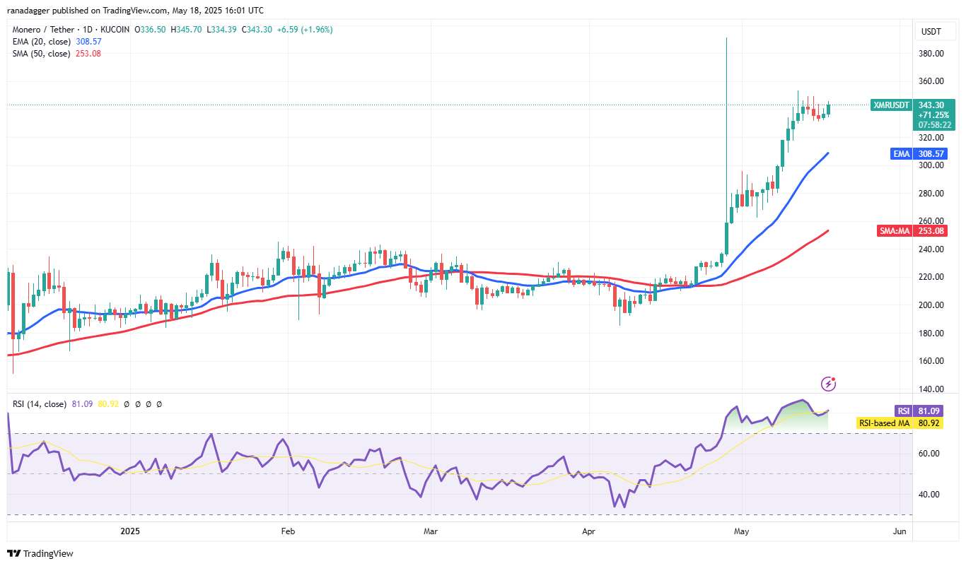Monero (Xmr) Am 12. Mai von 262 US -Dollar am 4. Mai stark auf 353 USD versammelt, was auf den aggressiven Kauf der Bullen hinweist.
