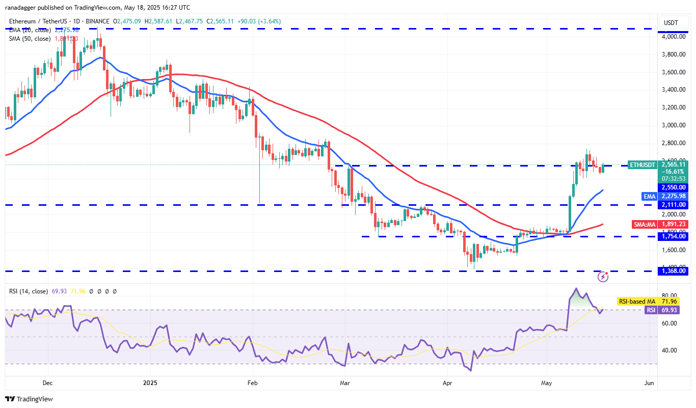 Der upsloping 20-Tage-exponentielle gleitende Durchschnitt (2.275 US-Dollar) und der RSI in der Nähe der überkauften Zone legen nahe, dass der Weg des geringsten Widerstands auf den Kopf ist. Wenn der Preis über 2.550 US -Dollar endet, werden die Bullen versuchen, ihre Position zu stärken, indem sie das ETH/USDT -Paar über 2.739 US -Dollar drücken. Wenn sie das schaffen, könnte das Paar auf 3.000 US -Dollar steigen.