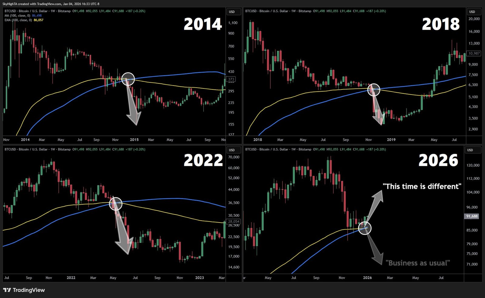 „Historisch gesehen kreuzen sich die wöchentlichen 100 EMA und SMA tief im Bärenmarkt. In jedem vorherigen Zyklus kam es innerhalb weniger Wochen zu einem Absturz um mehr als 50 % auf den Tiefpunkt des Zyklus“, so SuperBro schrieb auf X.