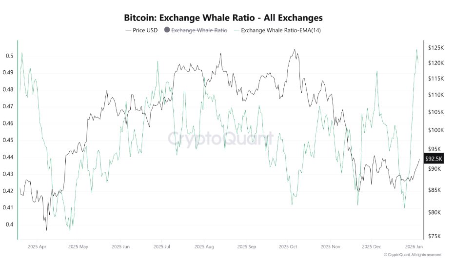 Der zweiwöchige gleitende Durchschnitt des Exchange Whale Ratio-Indikators, der den Anteil der Zuflüsse in die zehn größten Unternehmen misst, die von Walunternehmen stammen, ist nun auf dem höchsten Stand seit März 2025.