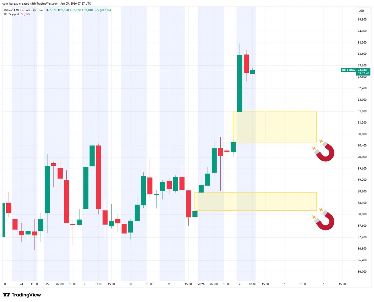 „Zwei CME-Lücken liegen mit 90.500 bis 91.600 US-Dollar und 88.200 bis 88.800 US-Dollar unter dem Preis“, so die Bitcoin-Bildungsressource Coin Bureau bestätigt.