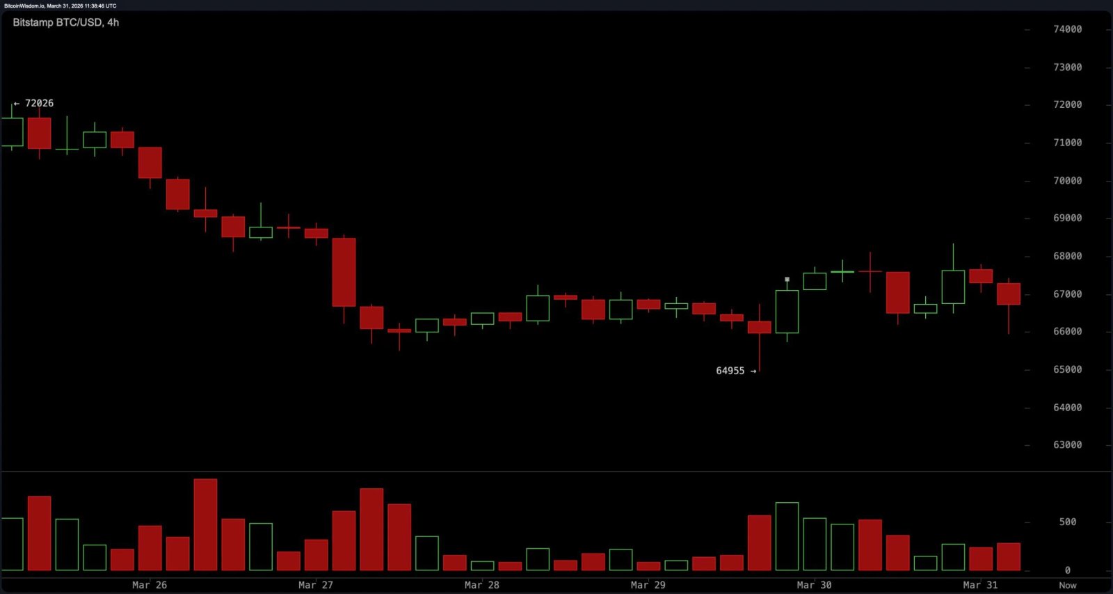 Die einstündige Bitcoin Die Grafik verdeutlicht die schwache kurzfristige Dynamik, wobei die unteren Höchststände immer noch intakt sind und die Preisbewegung leicht seitwärts tendiert bärisch Neigung. Ein bescheidener Aufschwung aus der 66.000-Dollar-Region konnte keine Nachwirkungen hervorrufen, was das Fehlen eines aggressiven Kaufdrucks verstärkt. Die Mikrostruktur bleibt fragil, der Preis schwankt stark und es bildet sich kein klares Ausbruchsmuster. Dieser Zeitrahmen weist auf das umfassendere Narrativ hin: Konsolidierung mit Abwärtsrisiko, sofern der Widerstand nicht überzeugend zurückerobert wird.