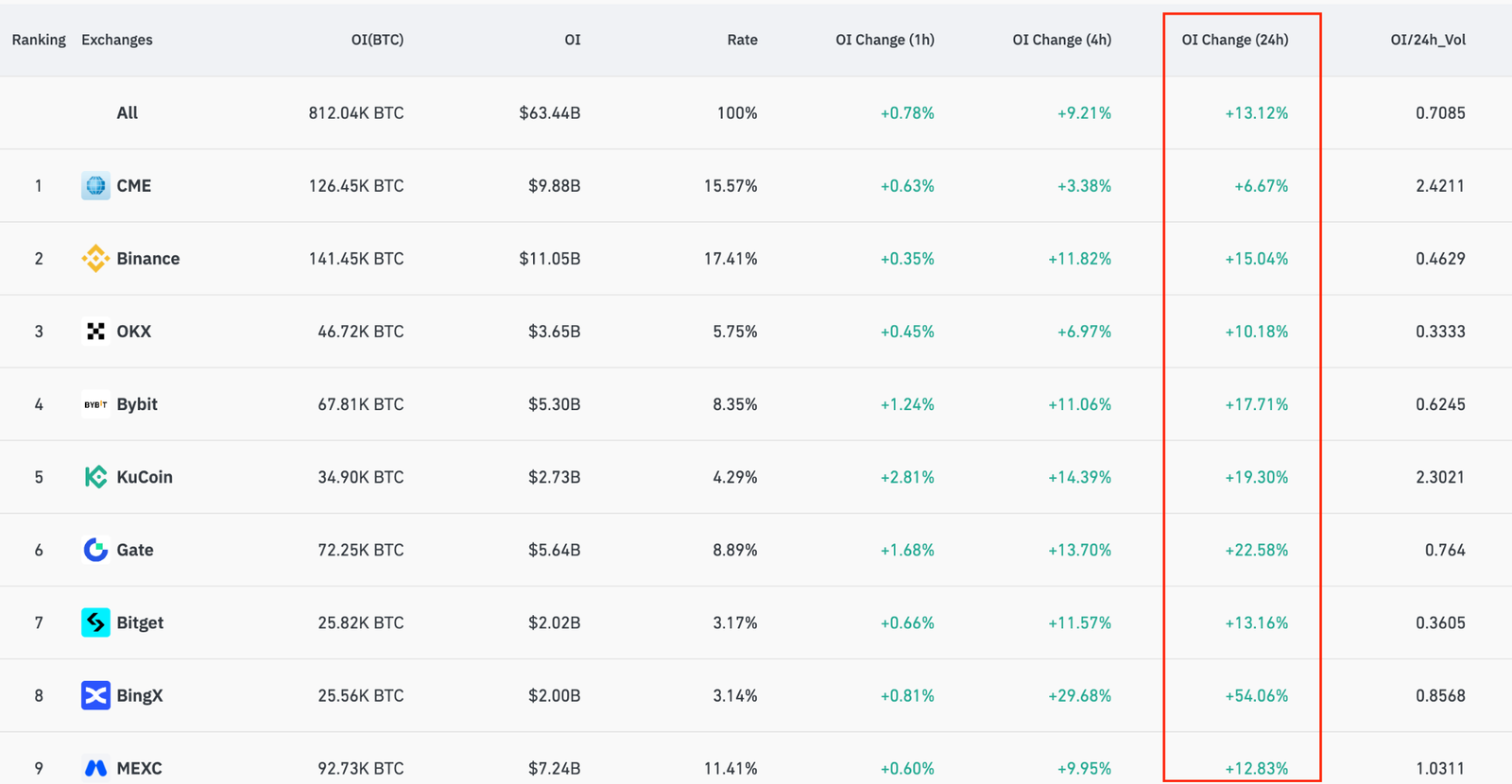 Große Cluster von Short-Liquidationen verstärken in der Regel die Reichweite von Vermögenserholungen, und Daten von CoinGlass zeigten einen Anstieg der gesamten Bitcoin-Futures um 13 % offenes Interesse (OI) in den letzten 24 Stunden.