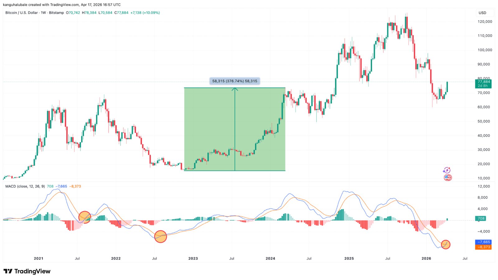 Der MACD-Indikator (Moving Average Convergence Divergence) von Bitcoin hat auf seinem Wochenchart einen Kauf signalisiert, ein Muster, das in der Vergangenheit starken Preisanstiegen vorausging.