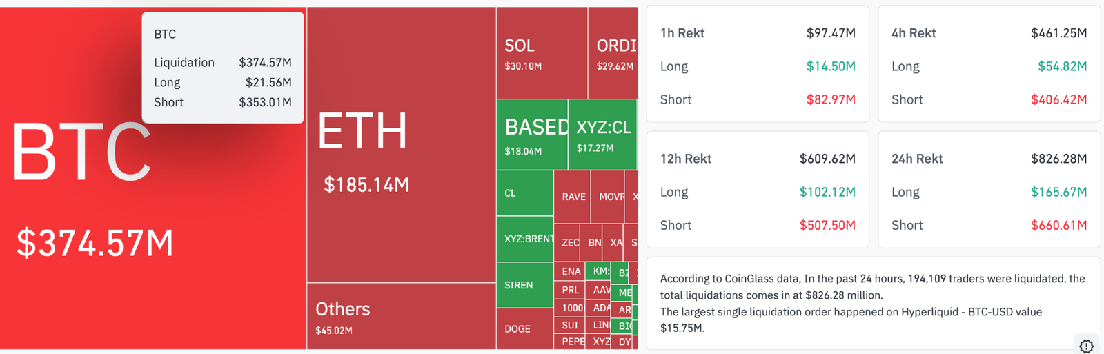 Insgesamt wurden in den letzten 24 Stunden 826 Millionen US-Dollar vom Terminmarkt vernichtet.