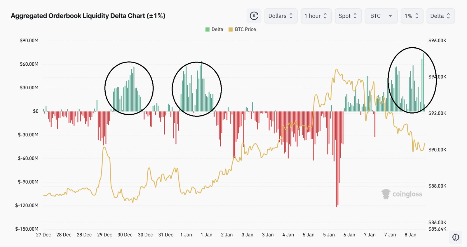 Daten von CoinGlass zeigt Das aggregierte Orderbuch-Liquiditätsdelta zeigt starke passive Gebote bei etwa 90.000 US-Dollar. In den letzten zwei Wochen kam es zu einer ähnlichen Absorption von Angeboten, die kurzfristigen Erholungen vorausgingen, ein Muster, das sich wiederholen könnte, wenn Käufer diese Zone weiterhin verteidigen.