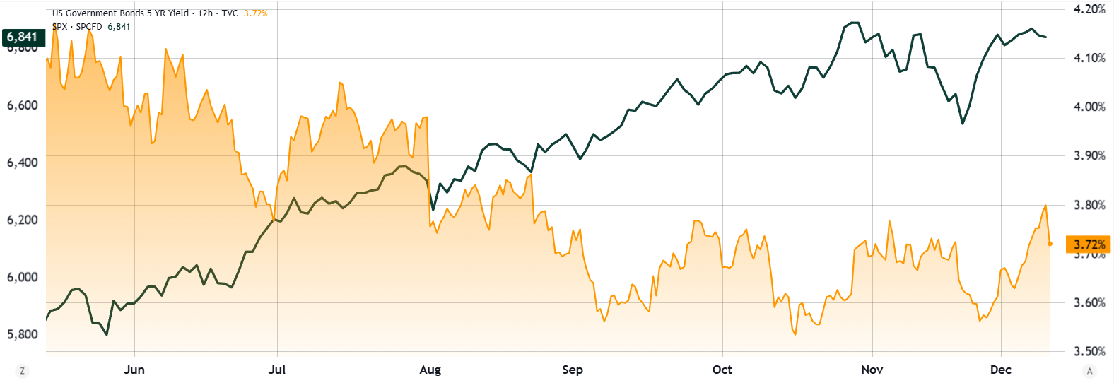 Die Rendite fünfjähriger US-Staatsanleihen lag am Mittwoch bei 3,72 %, ein Rückgang gegenüber 4,1 % sechs Monate zuvor, während der S&P 500 im gleichen Zeitraum um 13 % zulegte. Händler befürchten, dass das Wachstum der US-Staatsverschuldung zunehmen könnte den Dollar schwächen und den Inflationsdruck verstärken, was die relative Knappheit von Aktien trotz Bedenken hinsichtlich überhöhter Bewertungen attraktiver macht.