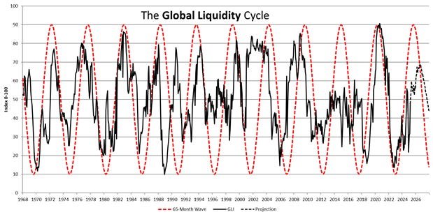 Zu einem kürzeren Zeitrahmen folgt die globale Liquidität einem zyklischen Muster, wobei Michael Howell den aktuellen Zyklus bis Mitte 2026 auf den Höhepunkt projiziert.