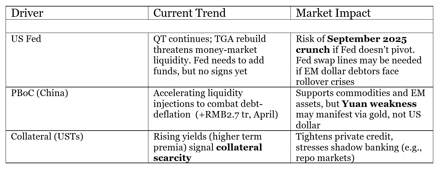 Michael Howell, Autor von “Capital Wars”, ” identifiziert Drei Haupttreiber, die sich derzeit auf die globale Liquidität auswirken: die US -Federal Reserve, die People’s Bank of China (PBOC) und die Banken, die über Kollateralmärkte leihen.