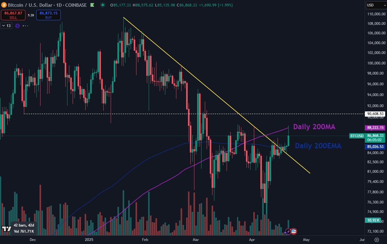“Interessanter Ort. Über dem Daily 200ema (blau) und dem diagonalen Widerstand brach bisher eine scharfe Ablehnung von The Daily 200 mA (Lila)”, Trader Daan Crypto Trades sagte in einem Beitrag auf X neben einem erklärenden Diagramm.