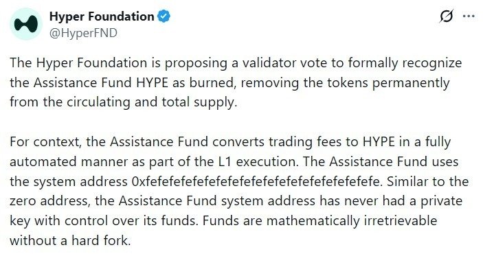 Die Hyper Foundation schlug eine Validierungsabstimmung vor, um HYPE-Token, die in der Assistance Fund-Systemadresse des Hyperliquid-Protokolls gespeichert sind, offiziell als dauerhaft unzugänglich anzuerkennen und sie vom Umlauf und Gesamtangebot des Vermögenswerts auszuschließen.