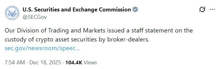 Die Handels- und Marktabteilung der US-Börsenaufsichtsbehörde (Securities and Exchange Commission) hat am Mittwoch dargelegt, wie Broker-Dealer tokenisierte Aktien und Anleihen im Rahmen bestehender Kundenschutzvorschriften verwahren können, und signalisierte damit, dass Blockchain-basierte Krypto-Asset-Wertpapiere in traditionelle Wertpapierschutzmaßnahmen eingeordnet und nicht als neue Kategorie behandelt werden.