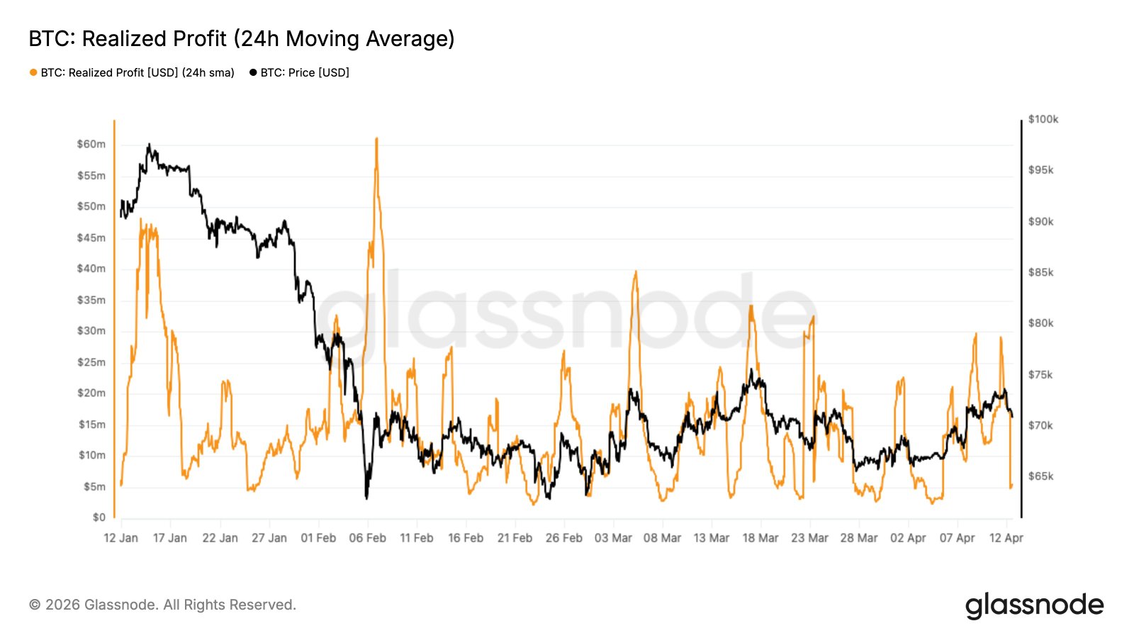 „Als der Preis den Bereich von 70.000 US-Dollar erkundete, stieg der realisierte Gewinn pro Stunde auf über 20 Millionen US-Dollar, was auf eine lokale Erschöpfung hindeutet“, schrieb Glassnode damals.