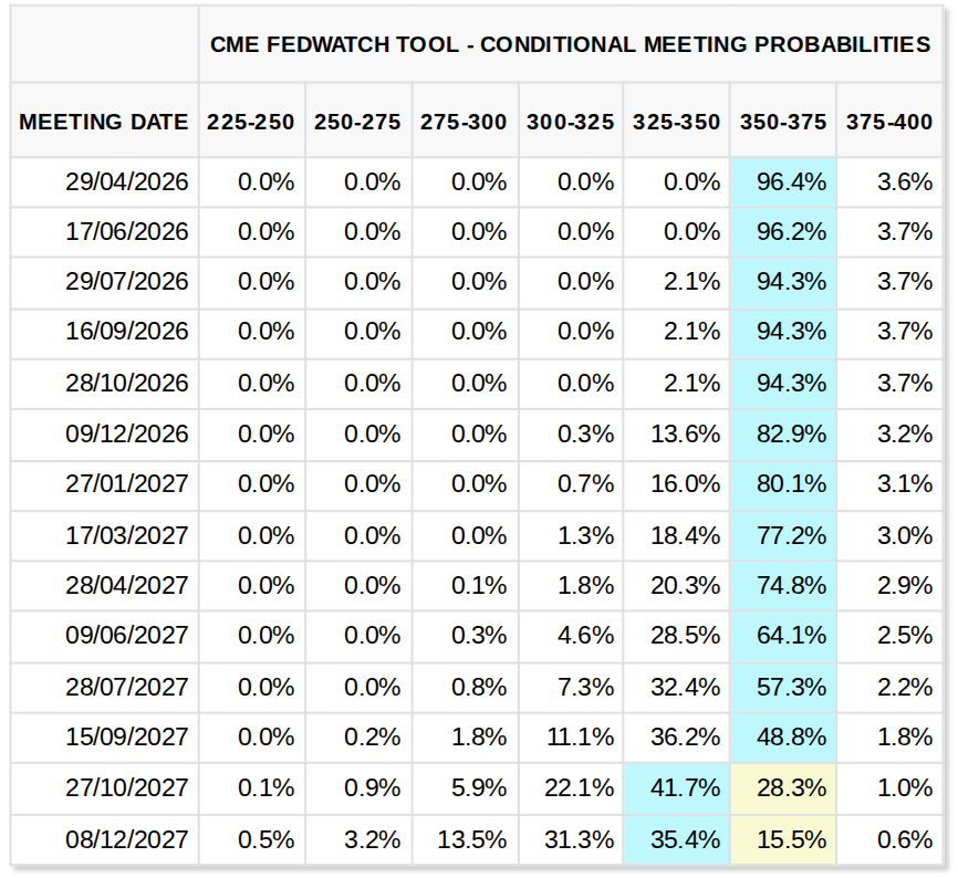 Die neuesten Daten der CME Group FedWatch-Tool zeigt, dass die Märkte bereits jetzt keine Zinssenkungen vor der zweiten Hälfte des Jahres 2027 erwarten.