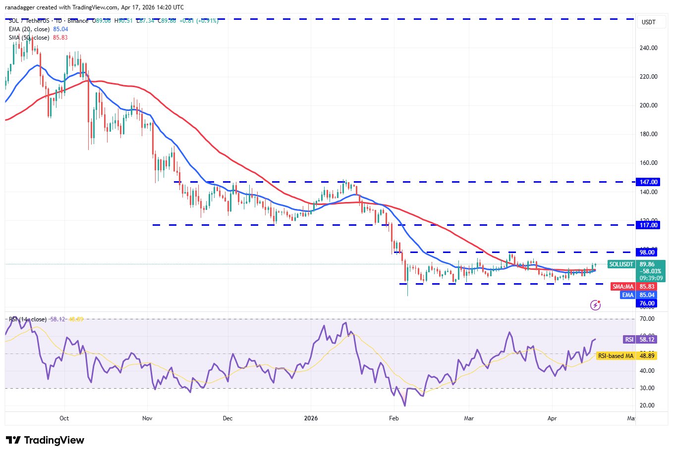 Solanas (SOL) über den gleitenden Durchschnitten schließt, deutet darauf hin, dass die Bullen versuchen, den Preis auf den Widerstand von 98 $ zu drücken.