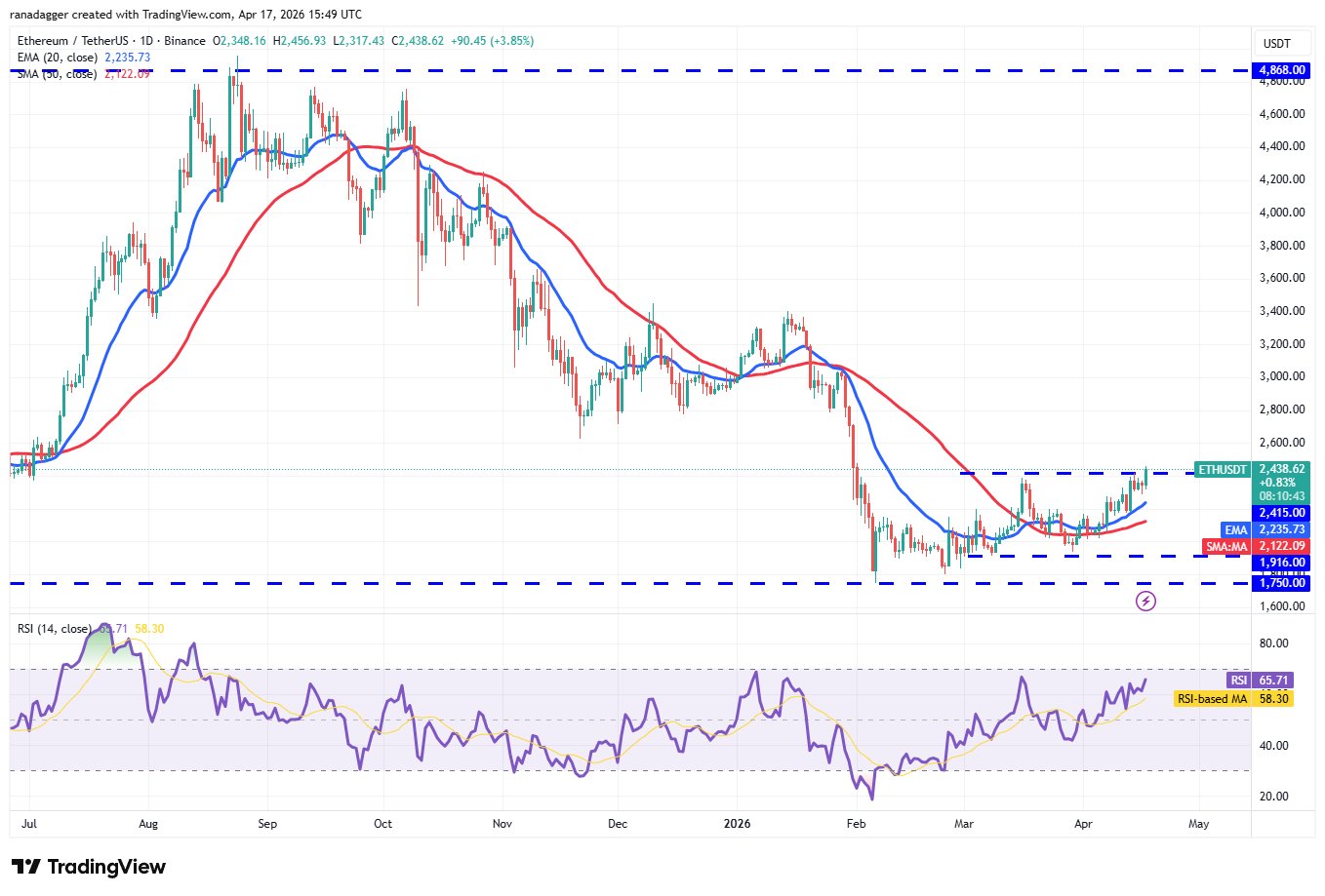 Verkäufer versuchten, die Erholung auf dem Niveau von 2.415 $ bei Ether zu stoppen (ETH), aber die Bullen übten weiterhin Druck aus und ließen nicht zu, dass der Preis unter den 20-Tage-EMA (2.235 USD) fiel.