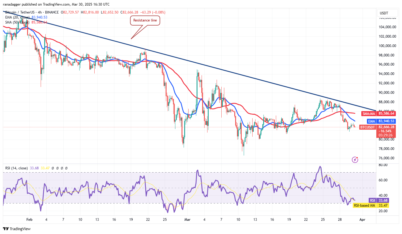 Der 20-tägige exponentielle gleitende Durchschnitt (85.253 USD) ist flach, und der relative Stärkeindex (RSI) liegt knapp unter dem Mittelpunkt, was den Bären einen leichten Vorteil bietet. Wenn die Unterstützung von 80.000 US -Dollar Risse, könnte das BTC/USDT -Paar auf 76.606 US -Dollar stürzen.