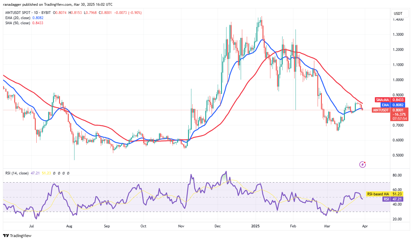 Wenn der Preis von der 20-tägigen EMA mit Stärke abprallt, wird eine Änderung der Stimmung durch den Verkauf von Kundgebungen zum Kauf von Dips vorgeschlagen. Dies verbessert die Aussichten auf eine Bruch über dem 50-Tage-SMA. In diesem Fall könnte das MNT/USDT -Paar auf 0,94 USD und später auf 1,06 USD aufsteigen.