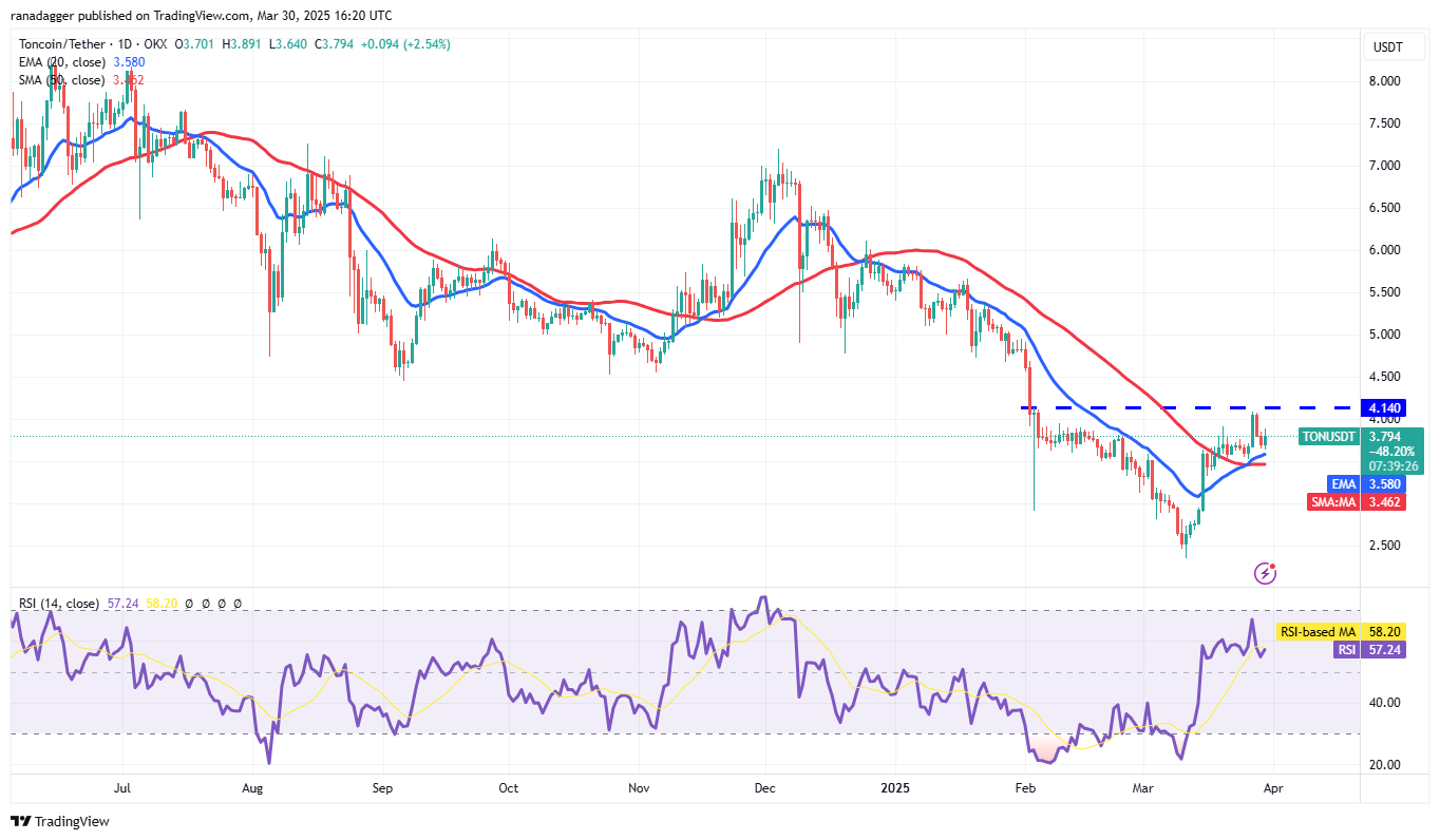 Die upsloping 20-Tage-EMA (3,58 USD) und die RSI in der positiven Zone geben den Käufern einen Vorteil an. Die Bullen werden versuchen, ihre Position zu stärken, indem sie den Preis über 4,14 US -Dollar drücken. Wenn sie es schaffen können, kann das Ton/USDT -Paar einen neuen Upmove auf 5 US -Dollar und danach auf 5,65 USD starten.
