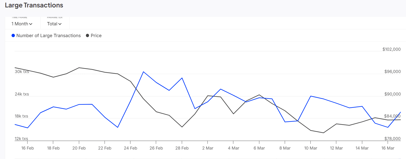 Zwischen dem 15. Februar und dem 17. März 2025 lag der Preis von Bitcoin zwischen 78.000 und 84.000 US -Dollar. Die großen Transaktionen stiegen während der Preispinus, gingen jedoch bei Dips zurück, insbesondere am 22. Februar und am 6. März.