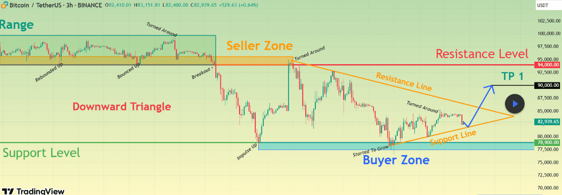 Bitcoins 3-stündiges Diagramm zeigt ein Abwärtsdreiecksmuster mit Unterstützung von 82.939,65 US-Dollar und Widerstand in der Nähe von 94.000 USD.