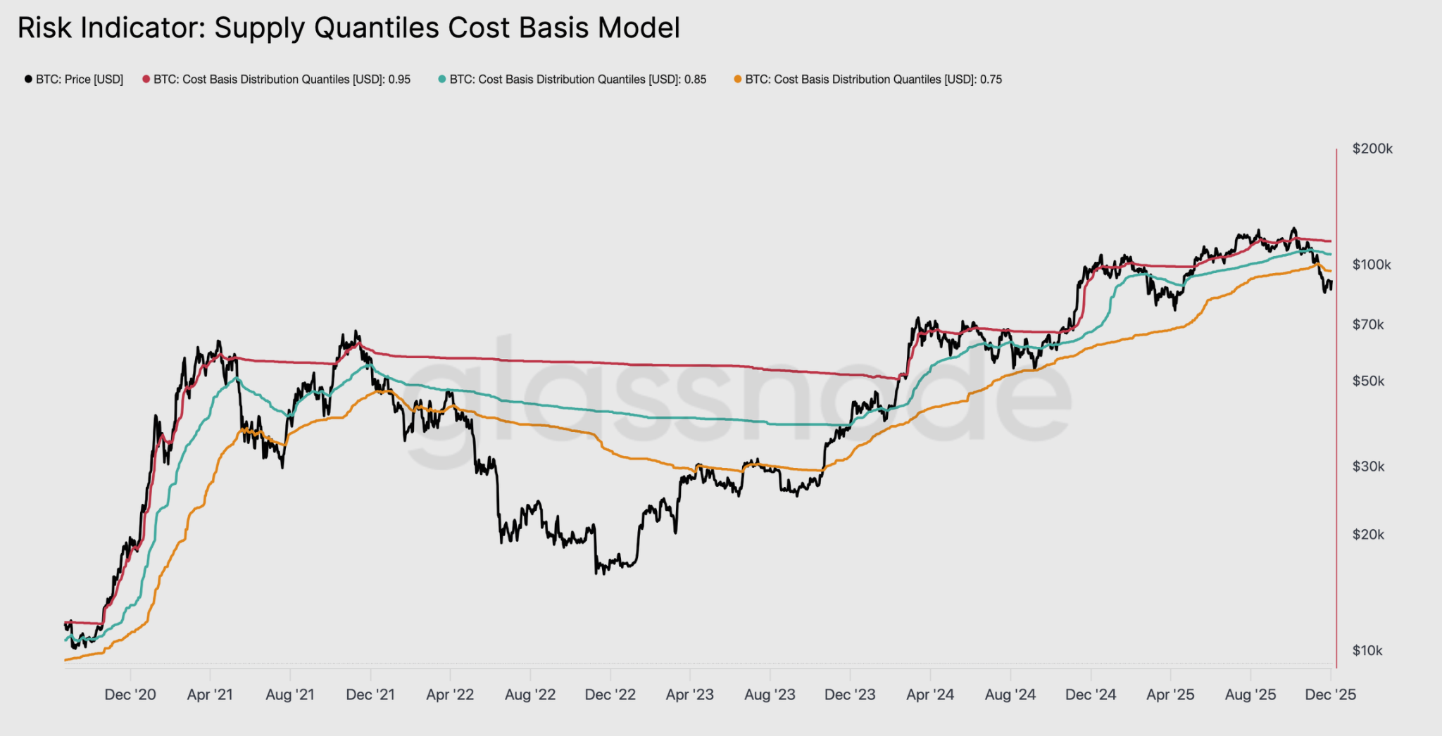 Die Ähnlichkeit wird durch ein Supply Quantiles Cost Basis-Modell bestätigt, das den Eintrittspreis der größten Münzcluster verfolgt. Seit Mitte November ist der Bitcoin-Preis unter das 0,75-Quantil gefallen und wird nun bei etwa 96.100 US-Dollar gehandelt, wodurch mehr als 25 % des Angebots unter Wasser liegen.