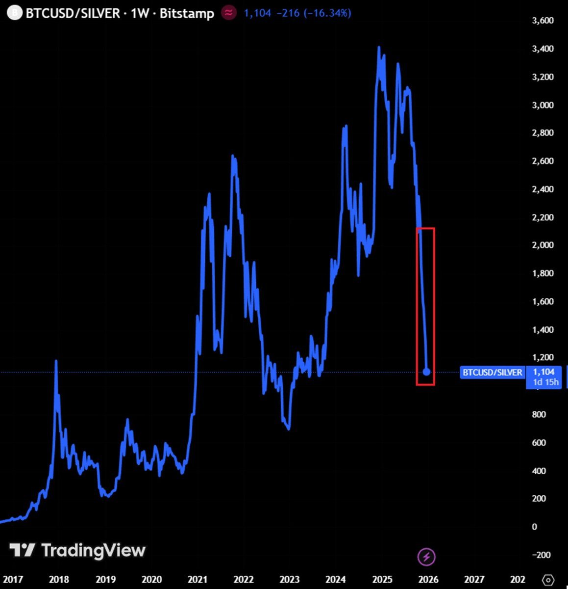 „Das Bitcoin-zu-Silber-Verhältnis ist jetzt auf 1.104 gesunken, den niedrigsten Stand seit September 2023“, heißt es in der Handelsquelle The Kobeissi Letter kommentiert.