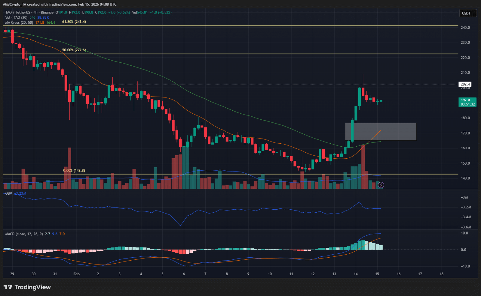 Die jetzige TAO Der Aufschwung kann sich über die lokale Angebotszone von 200 US-Dollar hinaus erstrecken. Die Fibonacci-Retracement-Levels bei 241,4 $ und 268,2 $ waren die kurzfristigen bullischen Kursziele.