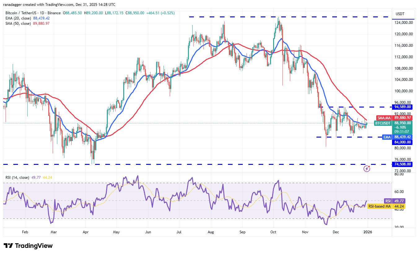 Die enge Konsolidierung knapp unterhalb des 20-Tage-EMA erhöht die Möglichkeit eines Durchbruchs über den 50-Tage-SMA (Simple Moving Average) (89.880 USD). In diesem Fall könnte das BTC/USDT-Paar bis zum oberen Widerstand bei 94.589 US-Dollar steigen.