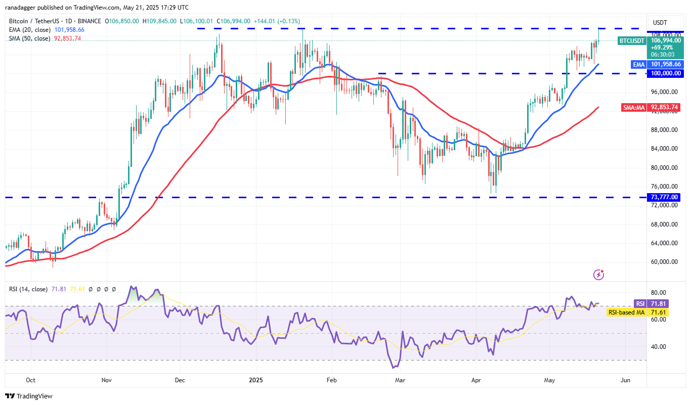Die upsloping bewegenden Durchschnittswerte und der relative Festigkeitsindex (RSI) in der überkauften Zone zeigen, dass die Bullen die Kontrolle haben. Wenn der Preis über 109.588 USD endet, könnte das BTC/USDT -Paar Dynamik aufnehmen und auf 130.000 US -Dollar springen.