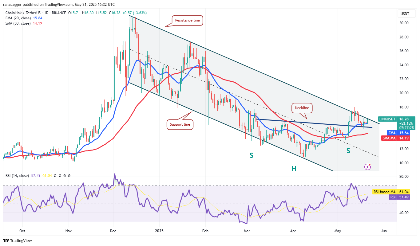 Die Bullen versuchen, ihre Position zu stärken, indem sie den Preis über die Widerstandslinie drücken. Wenn sie das schaffen, könnte sich das Link/USDT -Paar auf 18 US -Dollar versammeln. Die Verkäufer werden versuchen, den Aufzug bei 18 US -Dollar zu stoppen, aber die Rallye könnte sich auf 19,80 USD erstrecken, wenn sich die Bullen durchsetzen.