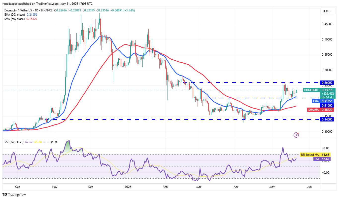 Die 20-tägige EMA (0,21 US-Dollar) ist im Trend und der RSI befindet sich in der positiven Zone, was signalisiert, dass Käufer den Befehl haben. Das Doge/USDT -Paar könnte sich auf das Niveau von 0,26 US -Dollar versammeln, was Verkäufer anziehen könnte. Wenn sich der Preis stark vom Overhead -Widerstand zurückweist, könnte das Paar für einige Zeit einen schmalen Bereich zwischen 0,26 USD und 0,21 USD bilden.