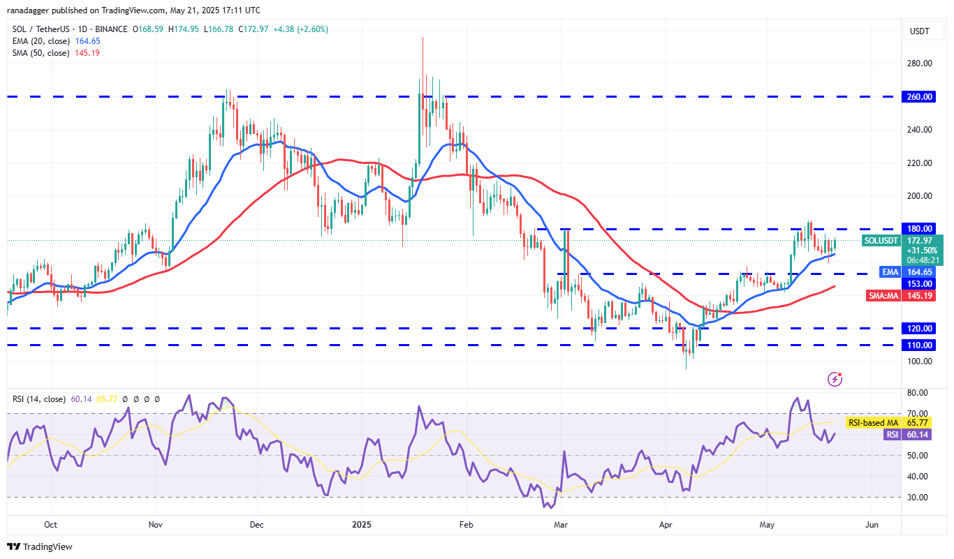Verkäufer konnten Solana nicht ziehen (SOL) unter dem 20-tägigen EMA (164 US-Dollar), was auf die Nachfrage auf niedrigeren Niveaus hinweist.