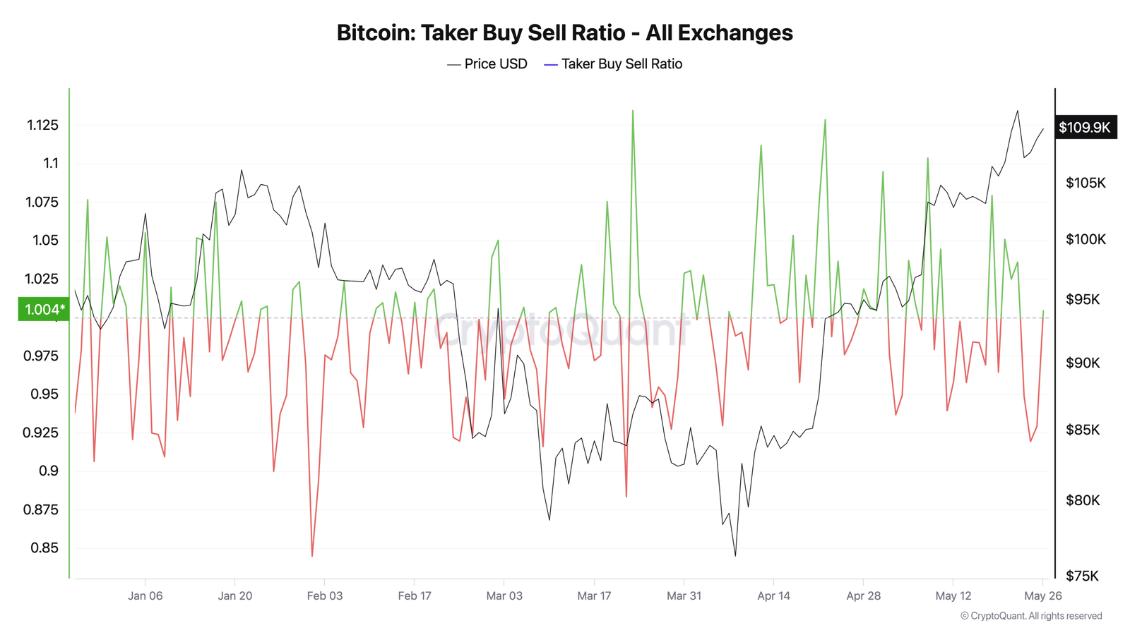 Das Taker Buy/Sell -Verhältnis verfolgt das Verhältnis von Kauf, um das Volumen während des ewigen Swap -Trades über die Abnehmer zu verkaufen, und am 25. Mai wurde er zum ersten Mal seit Anfang April unter die Hauptstufe von 1.