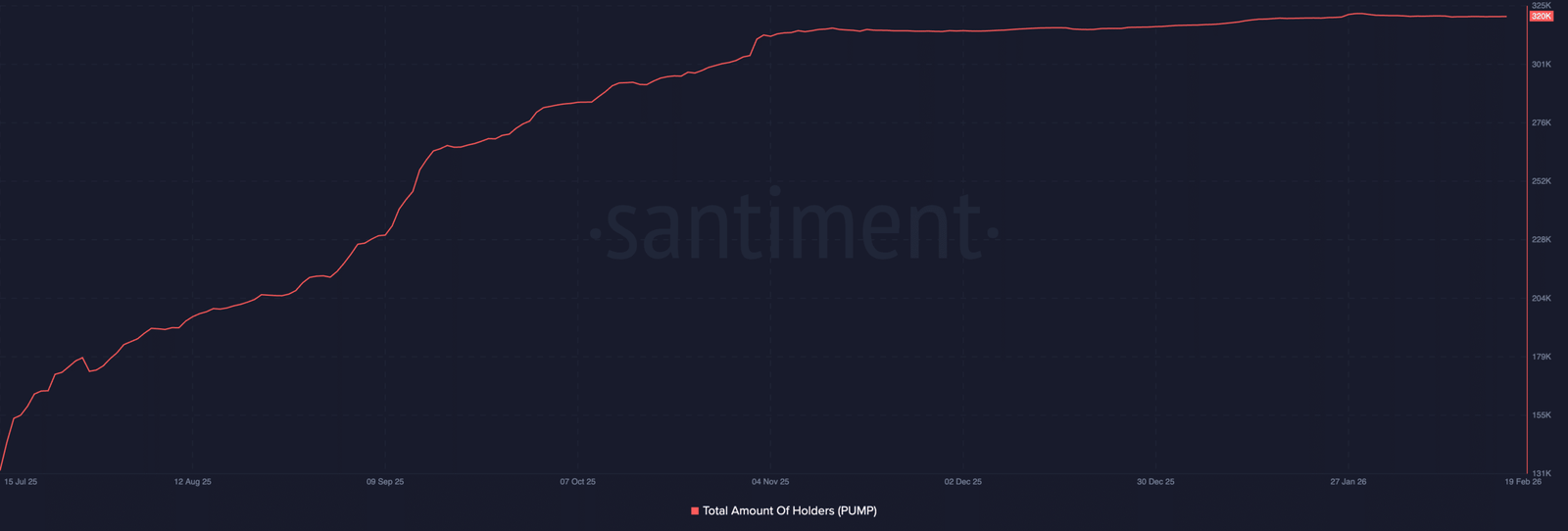 Santiment-Daten zeigen, dass die Gesamtzahl der $PUMP-Inhaber von Mitte 2025 bis Februar 2026 stetig ansteigt und übersteigt 320.000 Adressen. Die Preisentwicklung im gleichen Zeitraum erzählt jedoch ein anderes Bild.
