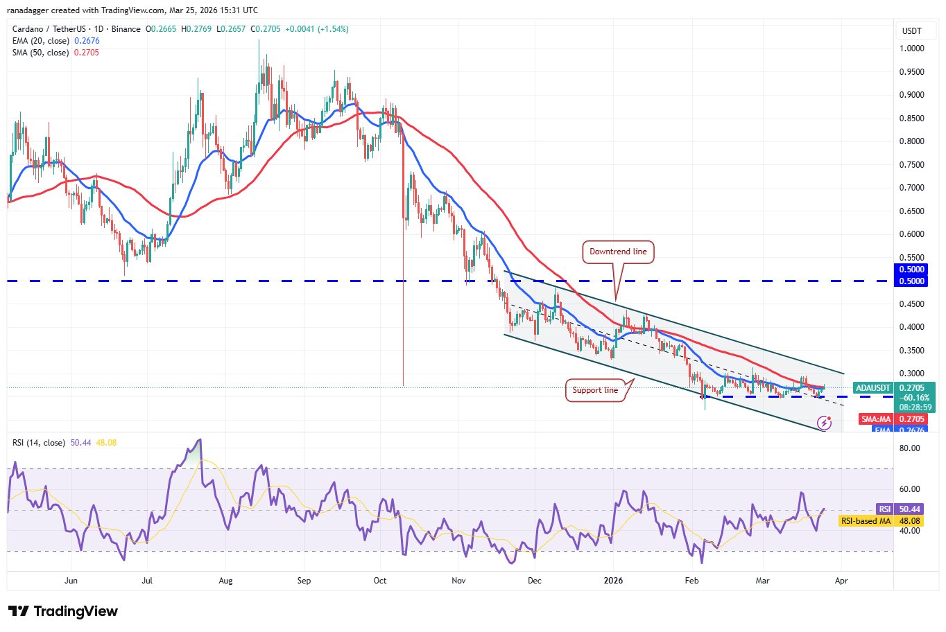 Cardano (ADA) bleibt innerhalb des absteigenden Kanalmusters stecken, aber die Bullen versuchen, eine Basis nahe der 0,25-Dollar-Marke zu bilden.
