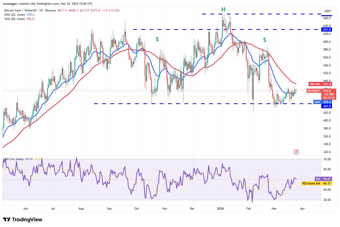 Das zeigt, dass die Bären auf höheren Niveaus aktiv sind. Die Verkäufer werden versuchen, ihre Position zu stärken, indem sie den BCH-Preis unter den 20-Tage-EMA ziehen. Wenn es ihnen gelingt, könnte das BCH/USDT-Paar auf die 443-Dollar-Marke fallen. Dies ist ein entscheidendes Niveau, das die Bullen verteidigen müssen, da ein Schlusskurs unter 443 US-Dollar ein rückläufiges Kopf-Schulter-Muster vervollständigt. Die nächste Unterstützung nach unten liegt bei 375 $.