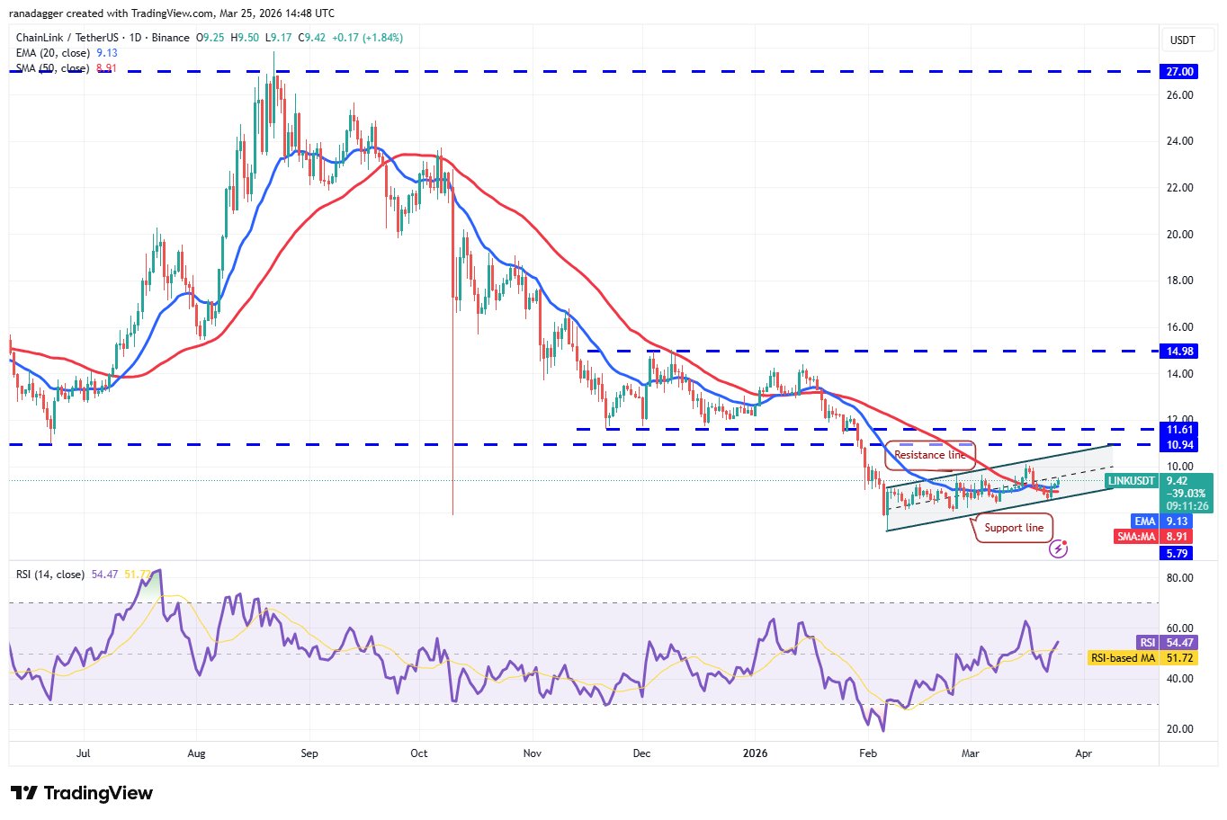 Die Bullen werden versuchen, den LINK-Preis an die Widerstandslinie des Kanals zu drücken, wo die Bären voraussichtlich eine starke Verteidigung aufbauen werden. Wenn der Preis von der Widerstandslinie abrupt abfällt, könnte das LINK/USDT-Paar noch einige Tage innerhalb des Kanals bleiben.