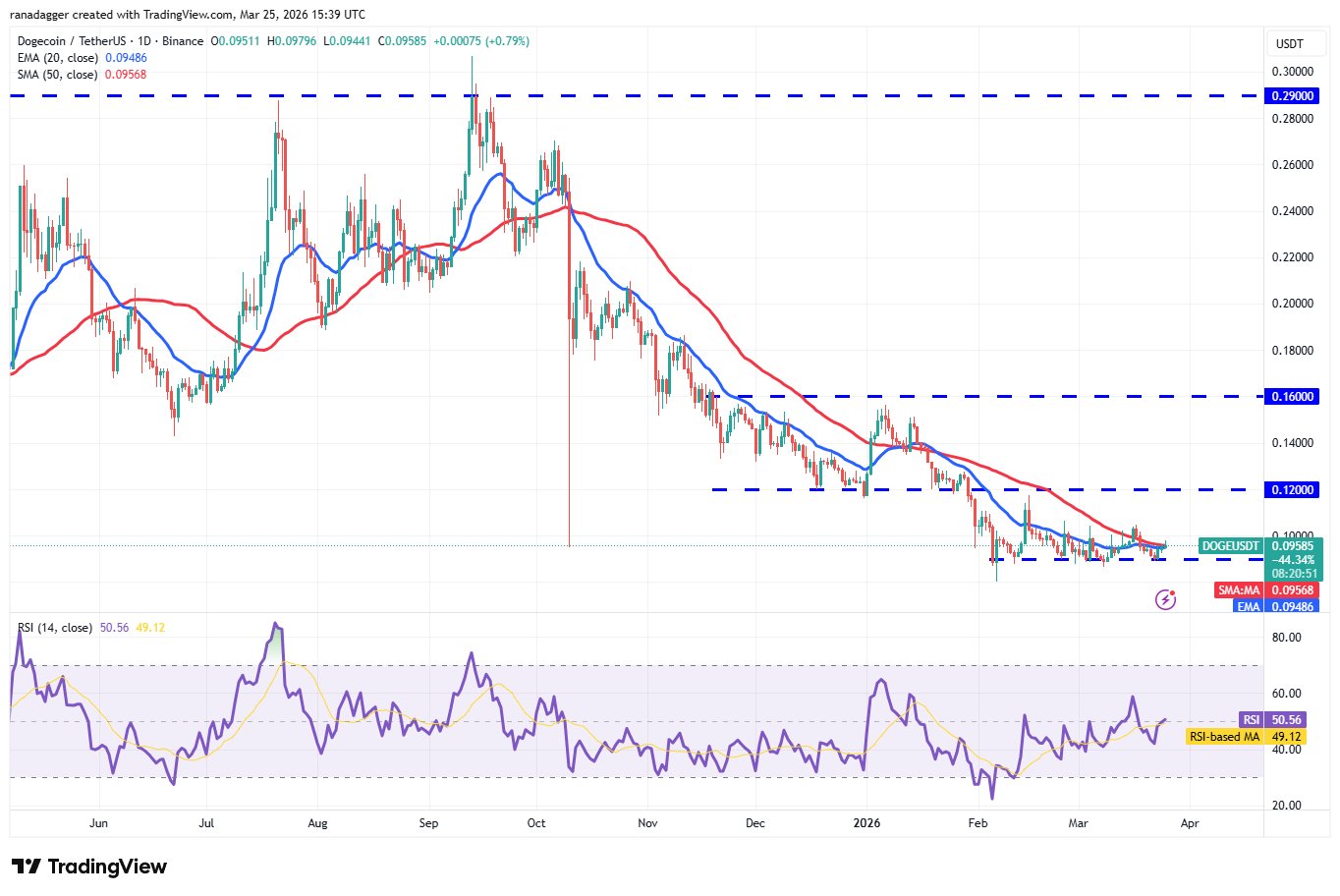 Dogecoin (DOGE) erholte sich am Montag von der 0,09-Dollar-Unterstützung, aber die Bullen haben Mühe, den Preis über die gleitenden Durchschnitte zu drücken.