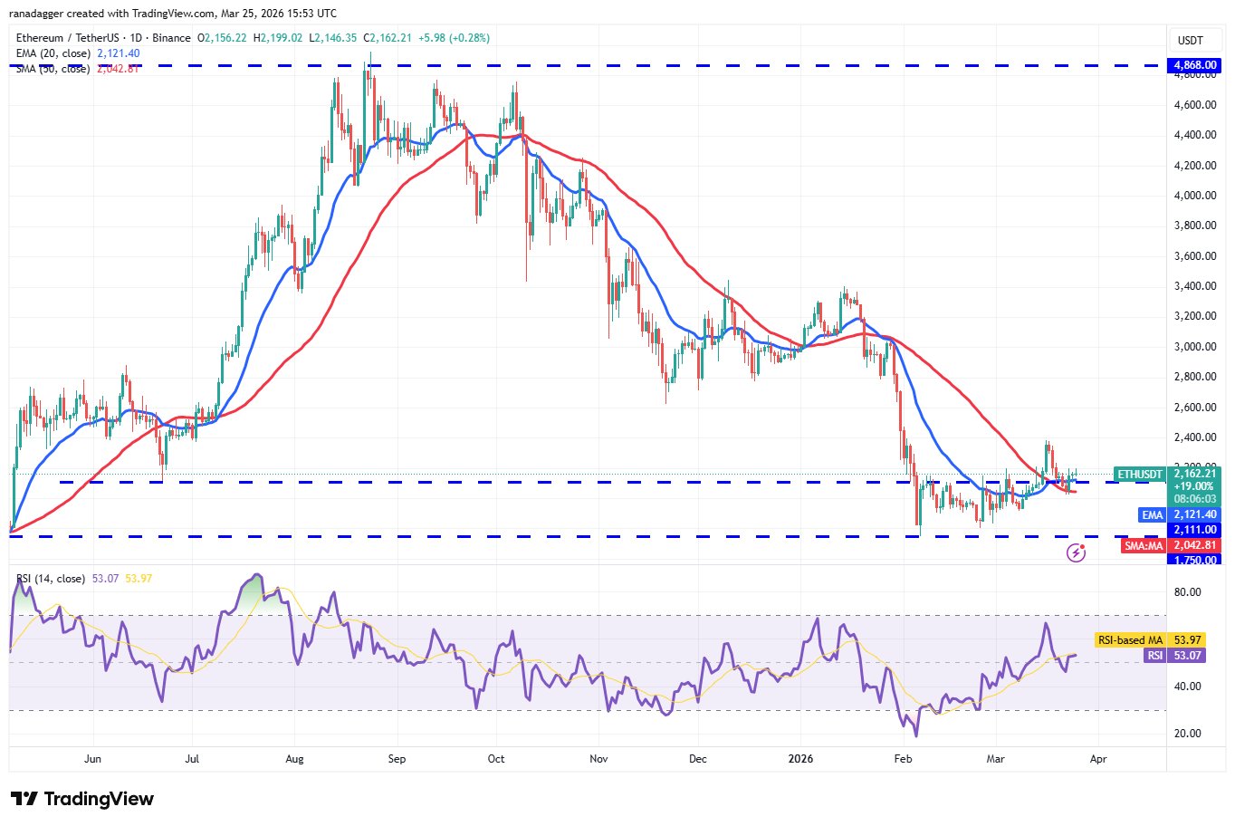 Der flache 20-Tage-EMA (2.121 USD) und der RSI nahe der Mitte deuten auf ein Gleichgewicht zwischen Angebot und Nachfrage hin. Käufer müssen den Preis über die 2.400-Dollar-Marke drücken, um den Beginn einer neuen Aufwärtsbewegung anzuzeigen. Das ETH/USDT-Paar könnte auf 2.600 $ und später auf 3.050 $ steigen.