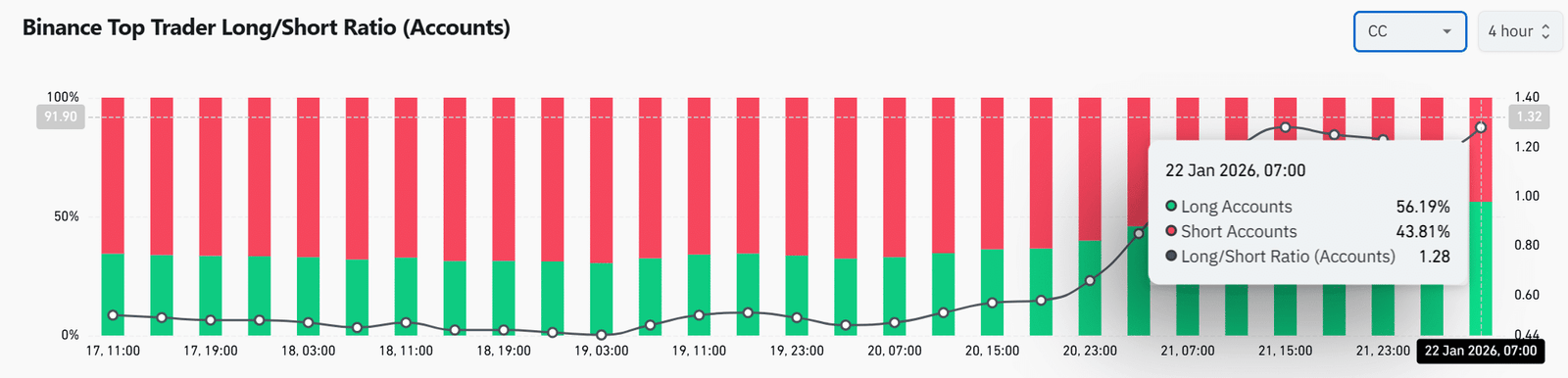 Binance-Top-Händlerdaten zeigen, dass Long-Konten etwa 56 % kontrollieren, was das Long-Short-Verhältnis auf nahe 1,28 bringt. Dieser Versatz unterstreicht die Richtungssicherheit ohne extremes Ungleichgewicht.