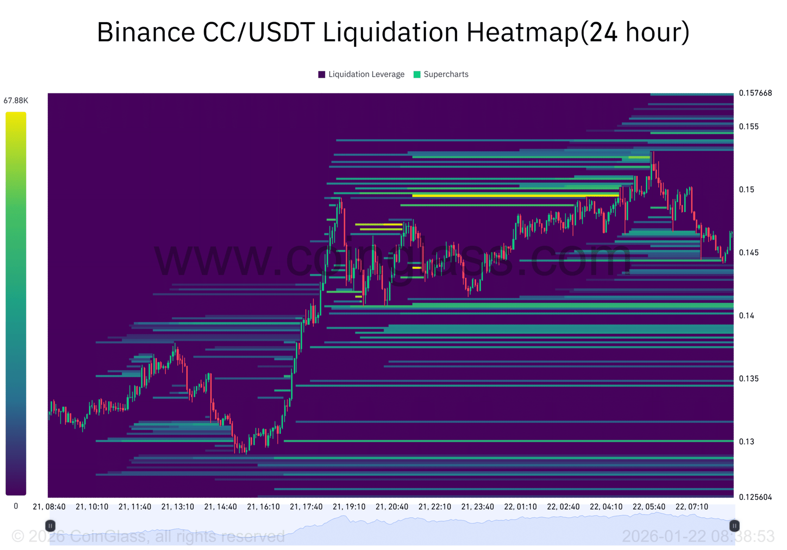 Diese Zonen stellen Bereiche dar, in denen gehebelte Short-Positionen bei einem Preisanstieg mit erzwungenen Ausstiegen konfrontiert sind. Canton näherte sich bereits ohne scharfe Ablehnung der 0,150-Dollar-Marke.