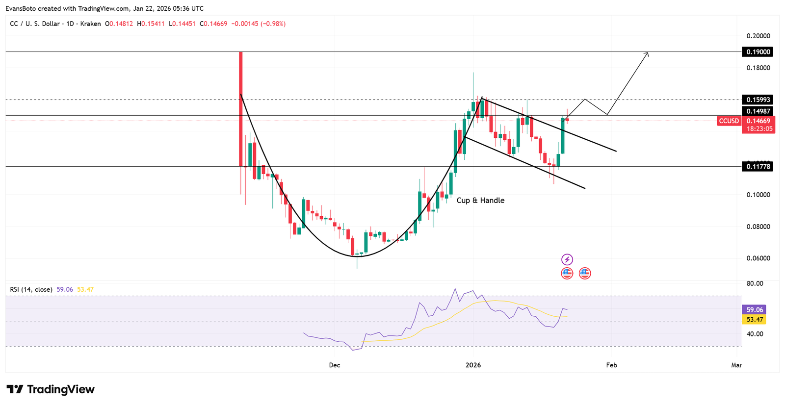 Wenn Canton die Akzeptanz über 0,150 US-Dollar aufrechterhält, würde die gemessene Bewegung mit Becher und Henkel ein Fortsetzungsziel in Richtung der Zone von 0,185 bis 0,190 US-Dollar prognostizieren, was mit sichtbarem Widerstand und Liquiditätsaufwand übereinstimmt.