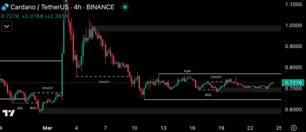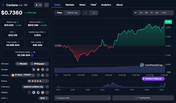 Cardanos Ada hält ein Marktwert von 0,74 USD Ab dem 24. März 2025, während er in den letzten 24 Stunden einen Preisanstieg um 4% zeigte.