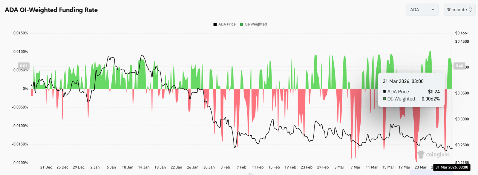 Allerdings ist die Cardano Der Preis hat diese Akkumulationsphase noch nicht widergespiegelt. Diese Divergenz deutet darauf hin, dass die Akkumulation derzeit eher als Basisbildungsprozess denn als Auslöser für eine Aufwärtsbewegung fungiert. Infolgedessen bildet dieses knappere Angebot eine strukturelle Grundlage, die einen zukünftigen Preisanstieg beeinflussen könnte.