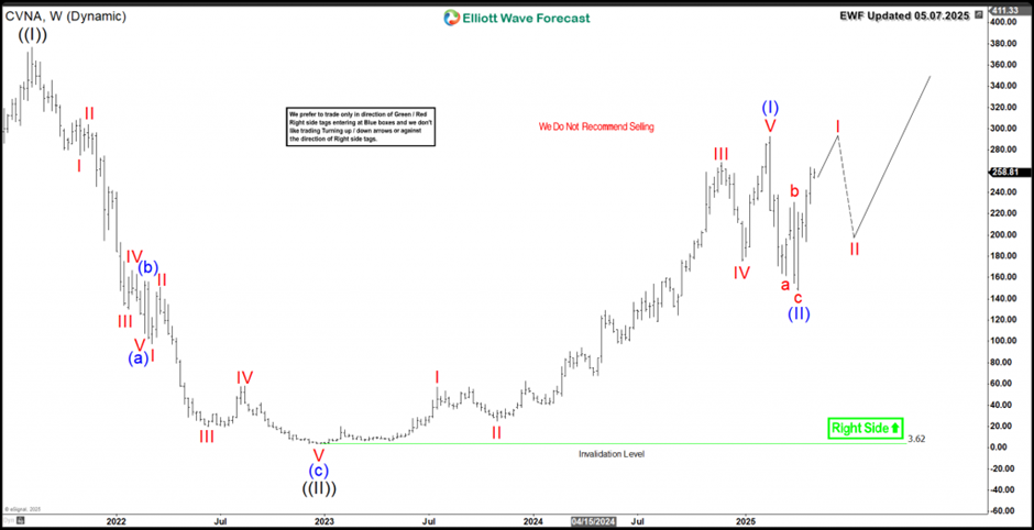 Das wöchentliche Diagramm von CVNA zeigt einen impulsiven 5-Wellen-Wechsel von der Welle ((ii)) bei 3,62 USD. Die Aktie stieg um 8000%und vervollständigte die Welle (i) bei 292 USD, gefolgt von einem 3-Wellen-Korrekturzug in der Welle ((ii)) und einem Boden von 142 USD.
