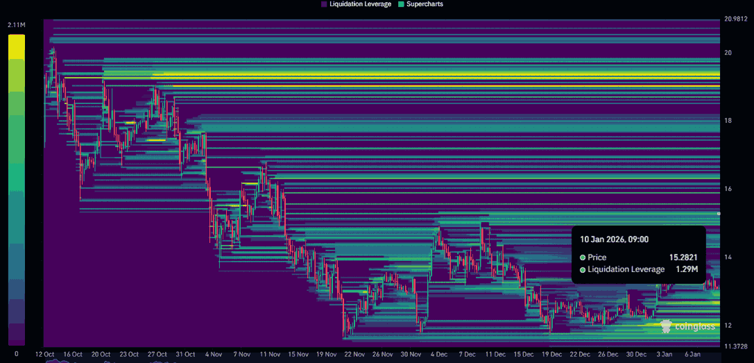 - Eine beträchtliche Liquidität nahe 15 US-Dollar zementiert es als wichtiges Ziel, wenn die Dynamik eine Umkehr bestätigt.